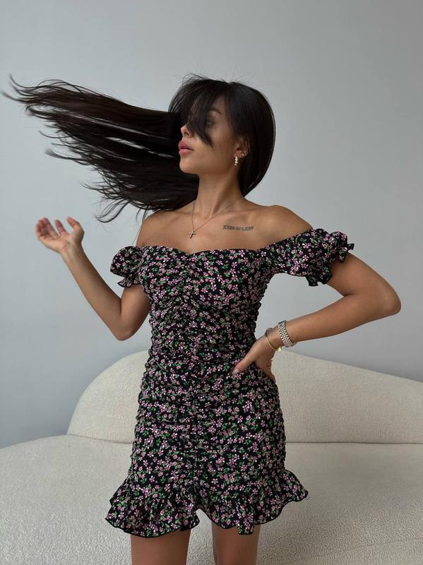cb: 1125 Тканина - софт Размеры - 42-44 и 44-46 Цвета - черный в крупный принт, черный в милый принт Если нужен Wow эффект - это платье точно для вас, идеально моделирующее фигуру за счет сборок, подчеркивает грудь и талию, рукавчики, которые можно надевать на плечи, или носить спущенными Супер качество и посадка