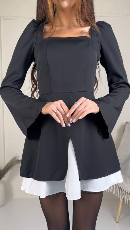 Платье мини короткая женская костюмка двойная юбка софт длинные рукава клеш спереди разрез...