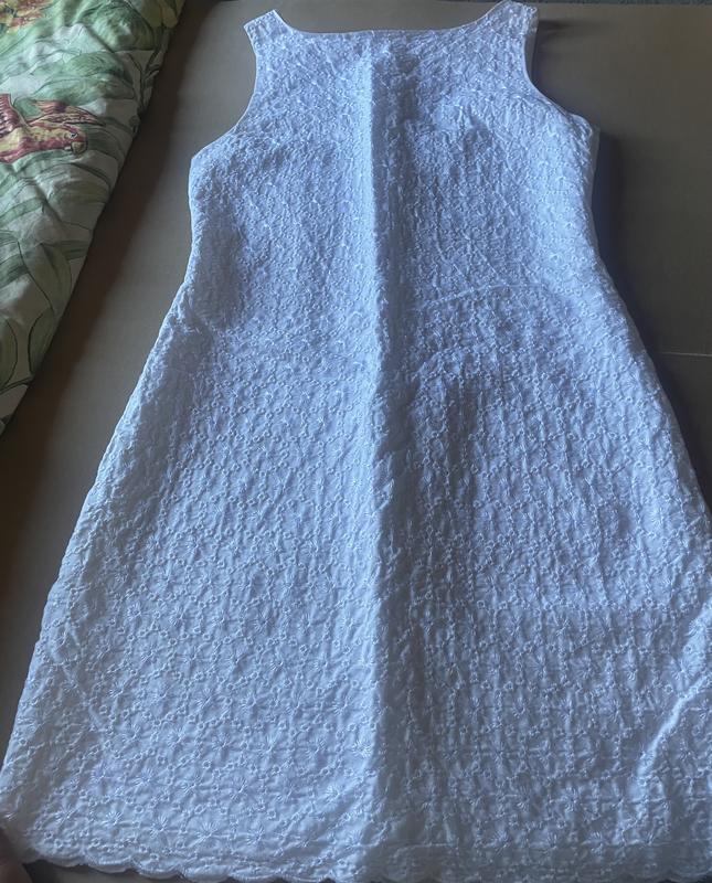 Сукня з прошви білого кольору фасону футляр на підкладці, застібка на молнії (колір такий як на 1 та 2 фото, на всіх інших камера не так передає через освітлення), ідеальний стан, по бірці вказано що сукня з дитячої лінійки (18 розмір), але я носила на свій розмір S та пізніше раз вдягла на невелику М. Орієнтуйтеся на заміри: довжина 84 см, під пахвами 43,5 см, стегна у найширший точці 45 см. Склад вказаний на бірці на фото. Недоліків немає, треба тільки випрасувати. Фото на тілі немає, так як не влізаю в нього.