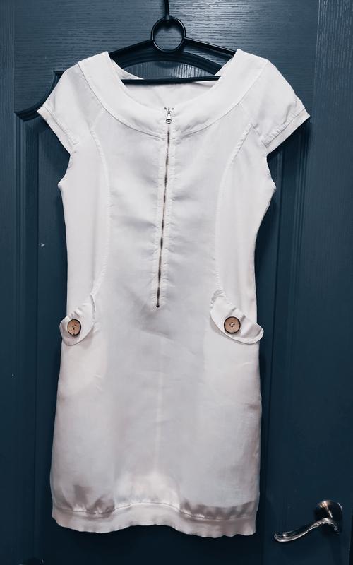 удобное белое платье, льняное, с трикотажной отделкой (боковые вставки, края рукавов, низ), есть красивые карманы с удивительными пуговицами, застежка молния хорошего качества, металлическая, замеры :плечо с рукавом 19, полуобхват груди в спокойном состоянии 45(но может быть больше за счет вставок трикотажных), талия 42,+, бедра 51,длина 90.