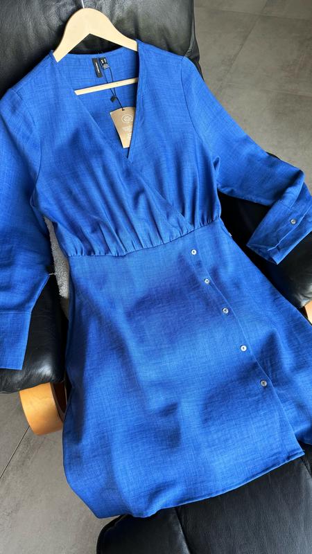 Насыщенный темно синий цвет,ткань на вид как лен. Очень стильное и красивое платье. Подойдет на полный размер М и небольшую Л.