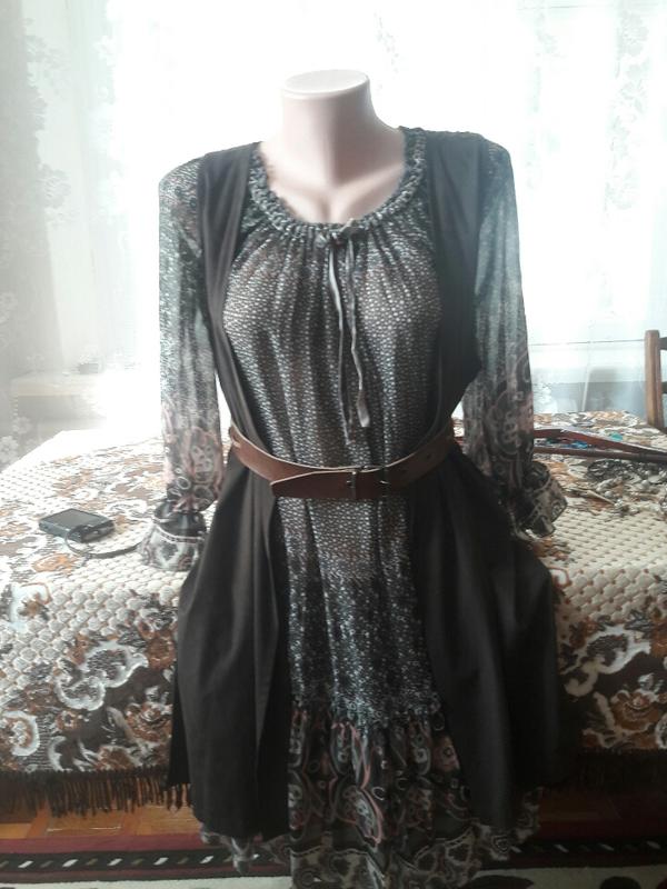 Легеньке модне платтячко з накидкою із штучної замші, стильне і красиве, пояс не звідси, рідний порвався, але можу додати цей. Розмір оверсайз. Плаття одягалось пару разів, своє, не секонд хенд. Додаткові фото, заміри вишлю за бажанням.