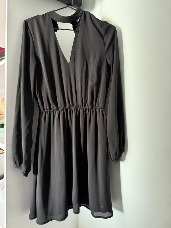 Платье в идеальном состоянии, в черном цвете. Интересный вырез на шее, легкое и стильное платье с резинкой на талии. Длина платья чуточку выше колен за рост 163. Размер на S.
