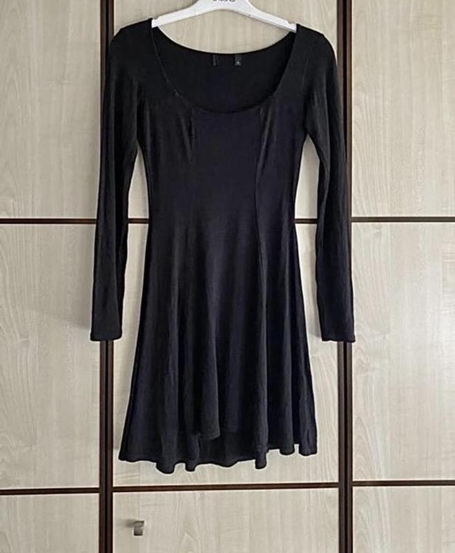 Коротке чорне плаття з віскози з еластаном. Довжина 82 см, рукав 58, плечі 38, по грудях 37, по талії 30, по стегнах 45-48. Чудово тягнеться на 16-18 см. Зверху тканина у два шари