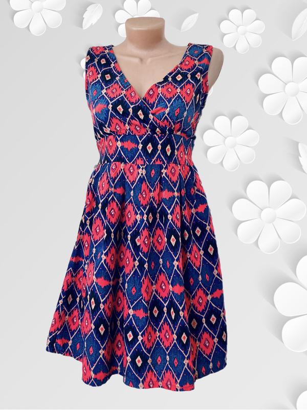 Летнее платье без рукавов, на поясе. На подкладке, не светится. Сзади по всей спинке молния. Замеры: НОГ 43см НОТ 33см Длина 83см