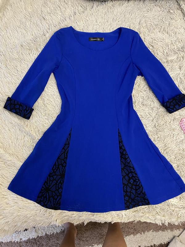 Темно-синя сукня жіноча , рукав три чверті, довжина рукава від плеча 41 см, довжина сукні 78 см, довжина від плеча до плеча 38 см, застібка на молнії збоку , пів обʼєм талії 33 см