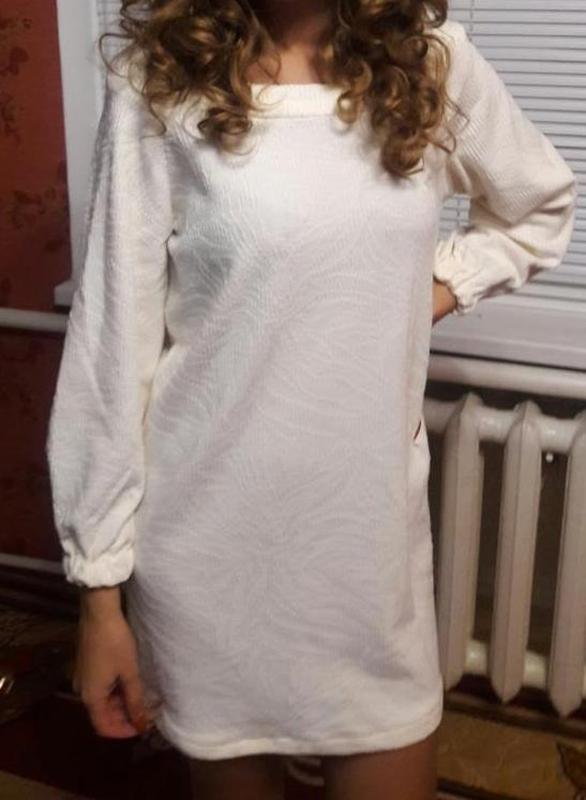Довжина 73-74 см, груди полуобьем 42-48 див. Колір - молочний, рукава трохи вкорочені були на резинці, але гумку вийняла, можна вставити в будь-який момент, якщо так комфортніше. Вгорі була стрічка ,яка стягувала горловину, але вона вийнята, без неї виглядає краще, але теж можна вставити назад якщо так комфортніше. Стан без дефектів.