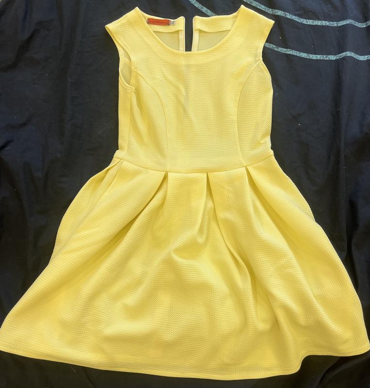 Дуже легка сукня лимонного кольору (ніжно-пастельний) менш яскрава ніж на фото. На застібці з тилу