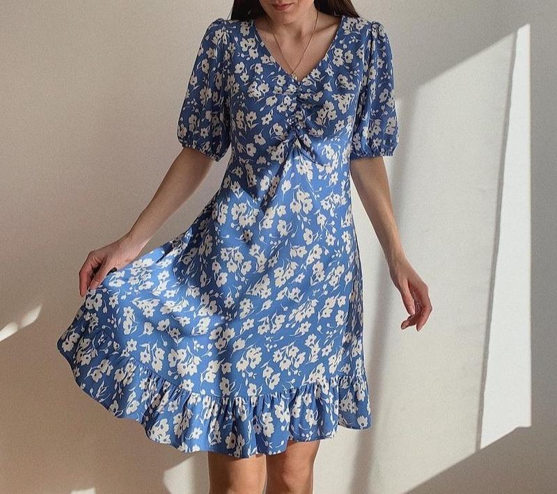 Блакитна сукня Без нюансів Довжина 90 см Плечі 33 см Рукава 30 см Груди 43 см Талія 35 см, позаду резинка та є пасок Ленка та приємно Колір передано на 1 фото