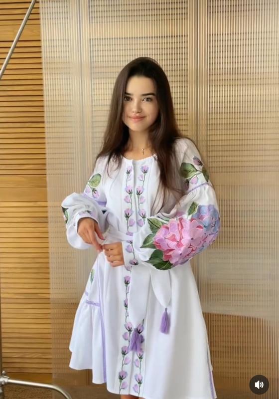 вышитое платье с цветком гортензией размер 40 42 44 46 тканина -домоткане полотно