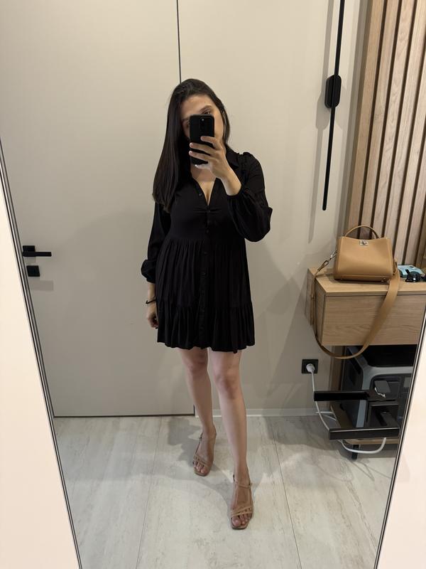 Черное вискозное платье Stradivarius. На гудзиках. З рюшами на плечах. Размер М/38. Состав - 100% вискоза Продаю, потому что больше не улажу (как видно на фото =( ) Состояние 10 из 10
