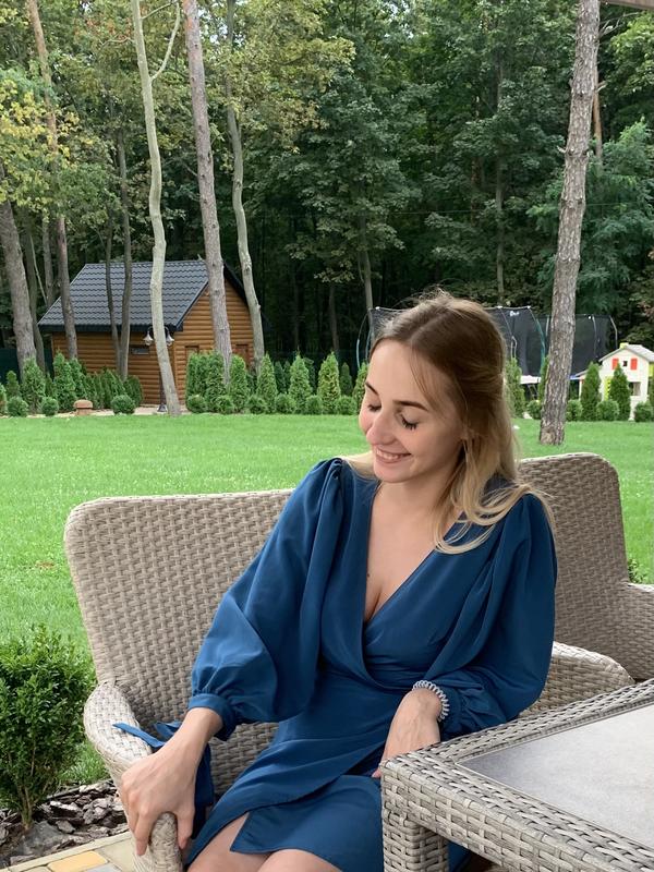Легкое платье темно-синего цвета, с объемными рукавами, на запах, в идеальном состоянии, одетое один раз