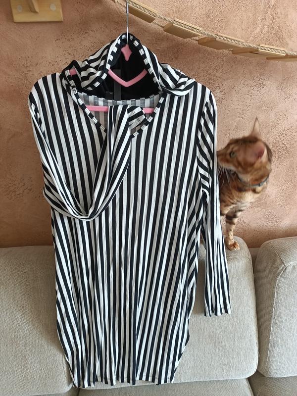 Очень оригинальное, стильное платье в полоску с капюшоном. Стан идеален. Слегка зауженная снизу. Розмір на бірці М НОГ - 48 см НОС - 58 см Длина 80 см. Ответим на любые вопросы.