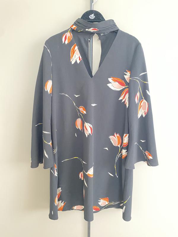 Плаття Zara, розмір s, вільного кроя, матеріал креп. Довжина виробу 82см Довжина рукава 55 см Ширина ОГ 48 Крій трапеція Ширина по низу 70 см.