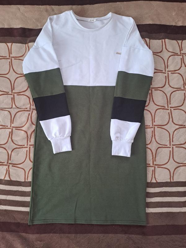 Простое платье с длинными рукавами на манжетах. Платье в спортивном стиле. Бело зеленого цвета. Размер 44 (S). Полуобхват груди - 44 см Полуобхват талии - 42 см Полуобхват бедер - 46 см Длина рукава (от плеча) - 65 см + манжет 6 см Длина платья - 87 см Платье в отличном состоянии.