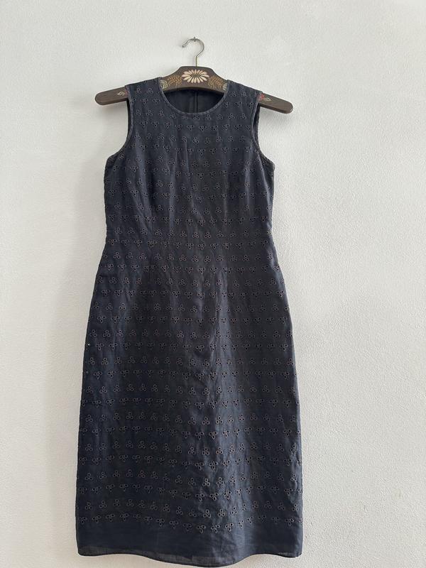 Базове ,стильне плаття з прошви. Стан ідеальний,є невеличкий дефект біля шву-в носінні не видно,в ціні враховано. Є підкладка. Колір основний чорний (мокрий асфальт)-оздоблення прошив-коричневий. Довжина від плеча 97 Пог 40-42 Пот 37-38 Поб 46-47 Без карманів. Пройма під руками 21 (напів обхват)