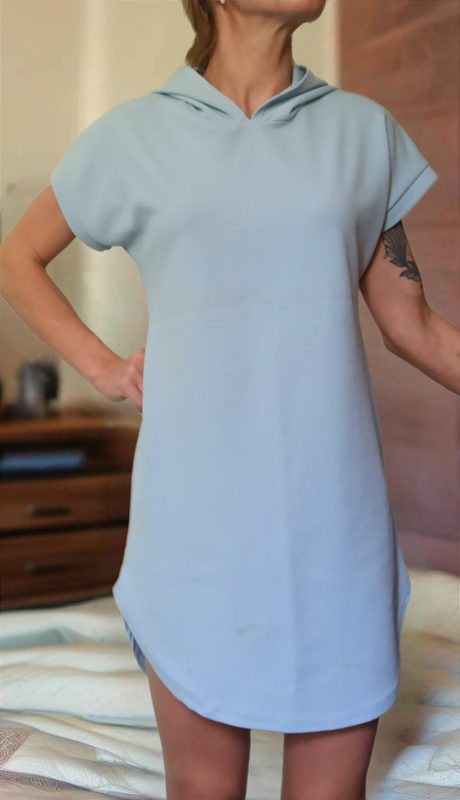 плаття з капюшоном ніжного голубого кольору розмір вказують M-L, тканина тянеться дуже гарно сідає по фігурі незвичайна, стильна модель сукні підійде під кросівки,балетки, босоніжки, кеди,і інше взуття одягнуто на зріст 165см, вага 54кг