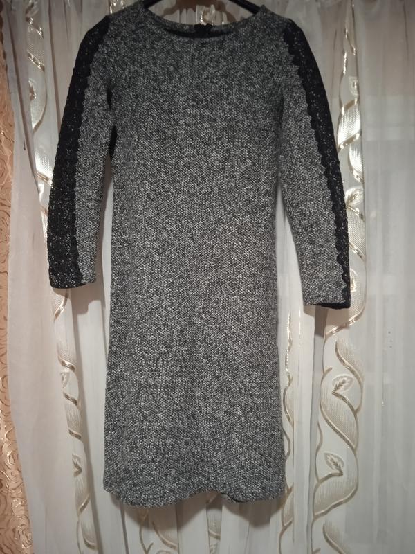 Шикарное теплое платье с кружевом на рукавах.На спине молния.Размер S-М..Др-53,ОГ-90,ОС-96,Довж.-92