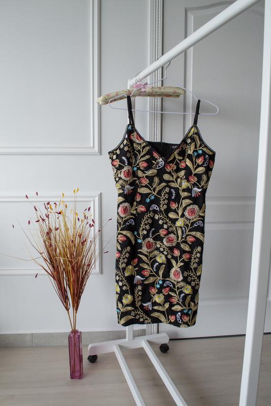 Красивое платье с вышивкой (всего спереди, сзади просто черная). Ткань тянется, по бирке размер 12. Бретели регулируются.