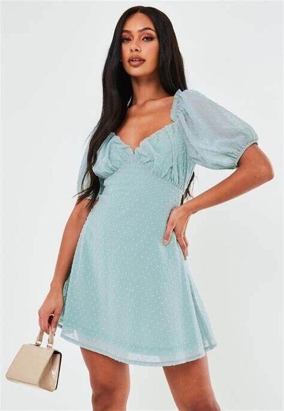 М'ятна міні коротка сукня плаття з пишним рукавом в горошок однотонне корсетне літнє шифон...