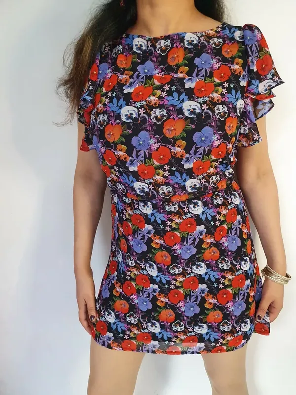 Платье шифоновое на подкладке, цветочный принт анютины глазки. На размер s, подойдёт и на xs. Отличное состояние.