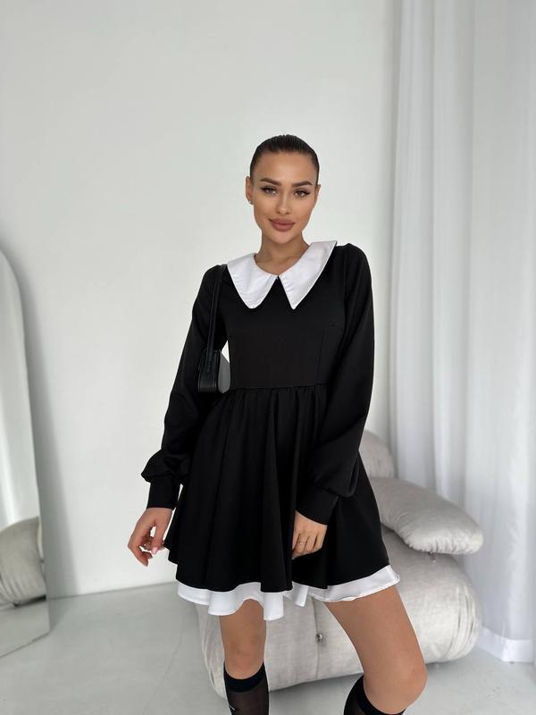 Ефектна та ошатна сукня міні з акцентом у вигляді білого коміра. Ця сукня підкреслить вашу фігуру і зробить ваш образ незабутнім 🔥 Розміри: 42-44, 44-46 Тканина: костюмка+котон Колір: чорний Сукня з підʼюбником‼️