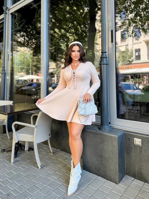 Модель No 605. Прогулянкова сукня. Платье, приталенное по верху, низ - полусолнце, впереди разрез со шнуровкой. Ткань мустанг рубчика, мелкая гладкая структура. Ткань хорошо тянется. Состав: Полиэстер - 95%, Хлопок - 5%. Цвет: Черный, Вишня, Бежевый Размеры 46-48, 50-52, 54-56, 58-60. Цена 890 грн Мерки платья 605 по готовому изделию 46-48 Объем груди - 88 см (растягивается 96 см), Объем талии -68 (растягивается до 86 см), Объем бедер - 168 см, Длина платья - 84 см, Длина рукава - 55 см 50-52 Объем груди - 96 см (растягивается 104 см), Объем талии -76 (растягивается до 92 см), Объем бедер - 174 см, Длина платья - 84 см, Длина рукава - 56 см 54-56 Объем груди - 104 см (растягивается до 112 см), Объем талии - 84 см (растягивается до 100 см), Объем бедер - 180 см, Длина платья - 85 см, Длина рукава - 57 см 58-60 Объем груди - 112 см (растягивается до 120 см), Объем талии - 92 см (Разтягивается до 108 см), Объем бедер - 186 см, Длина платья - 86 см, Длина рукава - 58 см #платье #бежевое #черный #brand_367