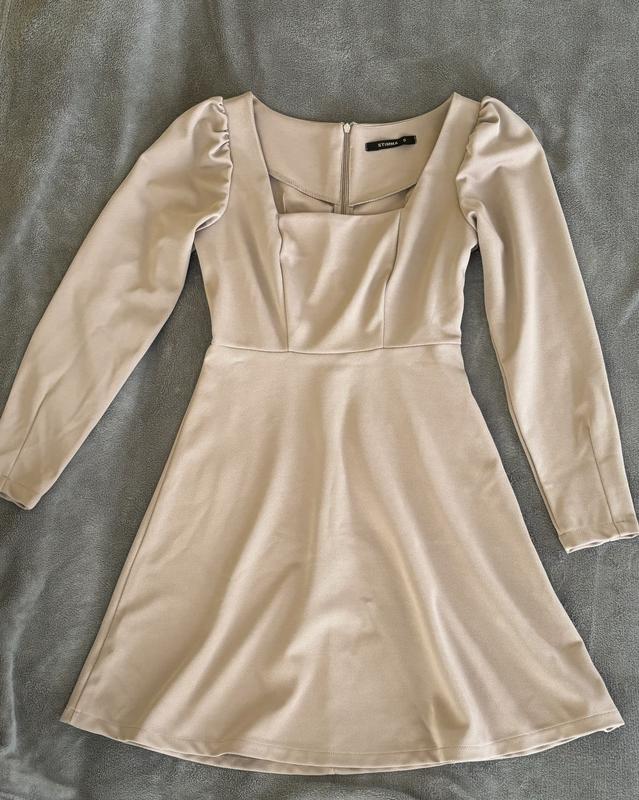 Платье с квадратным вырезом цвета мягко. Платье с длинным рукавом. Красиво подчеркивает талию. Сзади на застежке. Размер S Стан идеален, одевалась один раз Возможен торг
