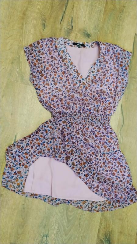 женское платье мини, не секонд,цвет свет сиреневый, легкий, на резинке по талии, рукав спущен, V - образный вырез, на подкладке. по рисунку проблесывает тоненькая золотистая риска. замеры:плече +рукав 21,пройма 21, полуобхват груди 52,талия в спокойном состоянии 32, (резинка + 8), длина платья 91., длина юбки от резинки 41.