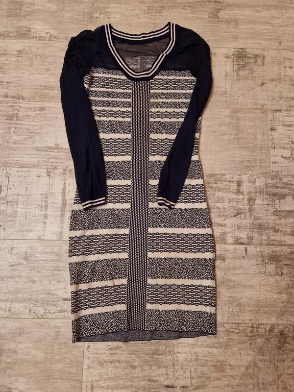 Платье трикотажное (машинная вязка) с рукавами из стрейч сетки. Длина изделия - 90 см. ПОТ - 35 см ПОБ - 40 см Трикотаж хорошо тянется. Стан идеален. Одетая один раз.