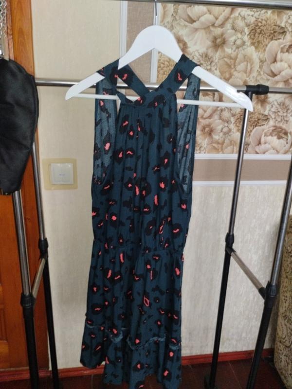 Платье впереди стойка воротничок присборенный,талия резинка, низ трапеция с оборкой, позада воротничок на завязках, в-образный вырез