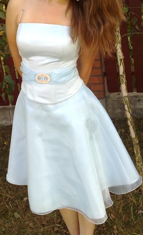 Продаю своє випускне плаття, довжина приблизно по коліно. Зазначений 44-й розмір, буде і на 42-й! Сукня в ідеальному стані, випрана, чистенька, випрасувана! Одягалась лише раз на випускний вечір! Сукня роздільна - корсет+спідниця. Корсет застібається на блискавку і шнурується, спереду прикрашений елегантною брошкою (всі камені на місці), під брошкою прикріплений поясок з блискучої органзи. Спідниця також на блискавці і шнурується, є петельки. Сукня складається з 4-х шарів тканини: блискуча органза (дуже гарно переливається на сонці), цупкий атлас, груба сітка і шовкова підкладка, завдяки цьому спідниця пишна и прекрасно тримає форму! Пересилаю по Україні Новою поштою, а Укрпоштою, є олх-доставка до кінця місяця.