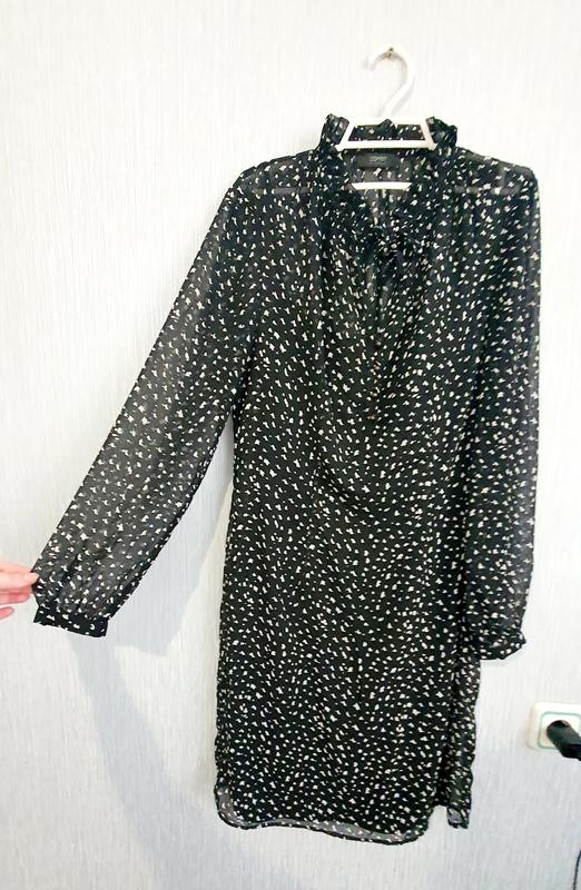Приталенное платье Esprit состоит из нижнего платья-подложи на тонких бретелях и верхней шифонового платья с длинным рукавом, на завязочке спереди и с металлическими пуговицами. Прямой крой, не тянется, вытачки на талии спереди и сзади. Длина 99 см, ПОТ 41 см, длина рукава 60 см. Нижнее платье можно использовать отдельно под другие прозрачные вещи.