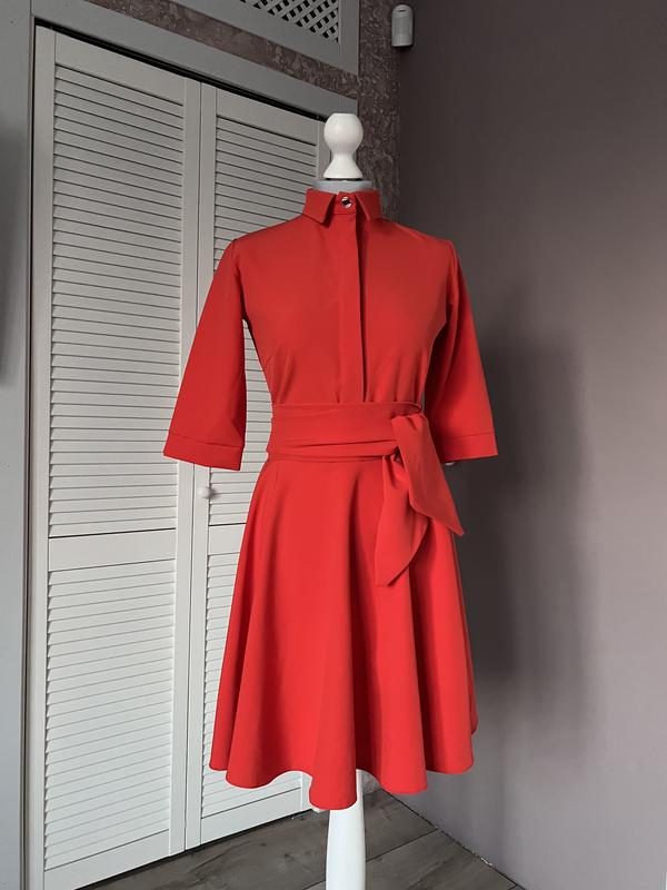Оранжевое платье с широким поясом, низ клеш, ткань стрейч, держит форму, скрытые пуговицы черного цвета, немножко выше колена, 36 (S) размер. Осень-весна, лето. Италия