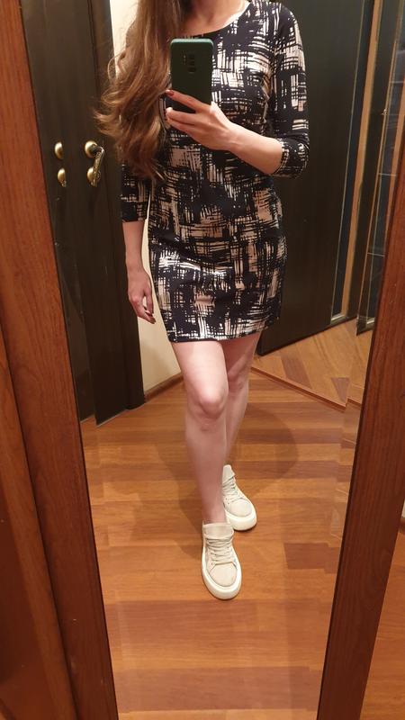 Трикотажная мини-платье. Красиво садится по фигуре, не подскакивает при ходьбе. Размер S-M. Хорошая длина 83 см - не покажете окружающим лишнего. Тянется. Мои параметры 89-72-96
