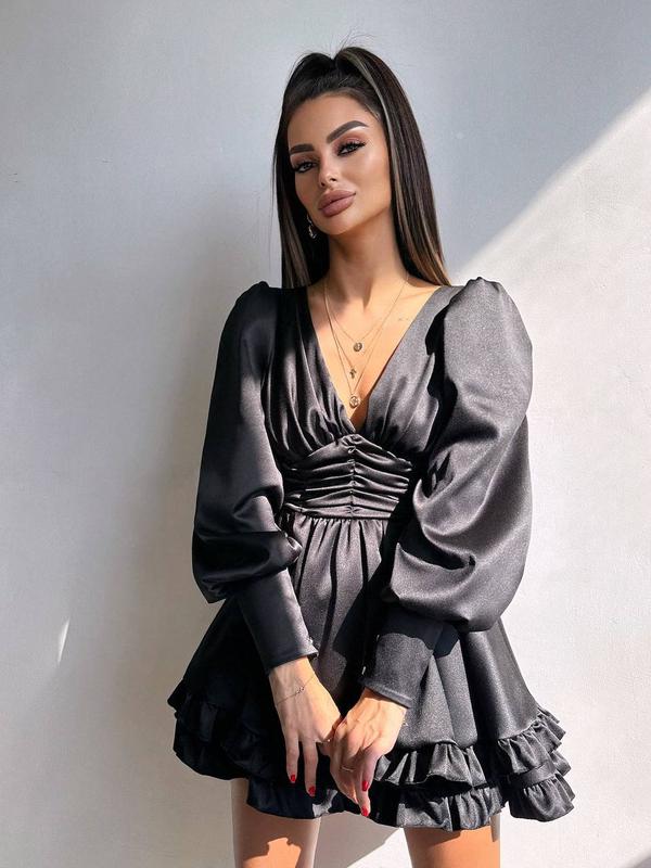 Атласное платье с пышной юбкой и объемными рукавами атласное платье мини с двойной юбкой