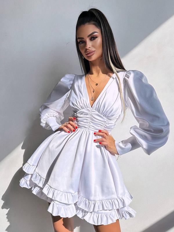 Атласное платье с пышной юбкой и объемными рукавами атласное платье мини с двойной юбкой