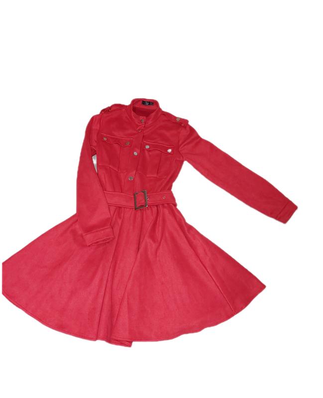 Платье женское красного цвета. Размер S, замшевая, застегивается на пуговицы заклепки, спереди на груди есть два кармана, на поясе есть ремень. В поясе хорошо тянется.