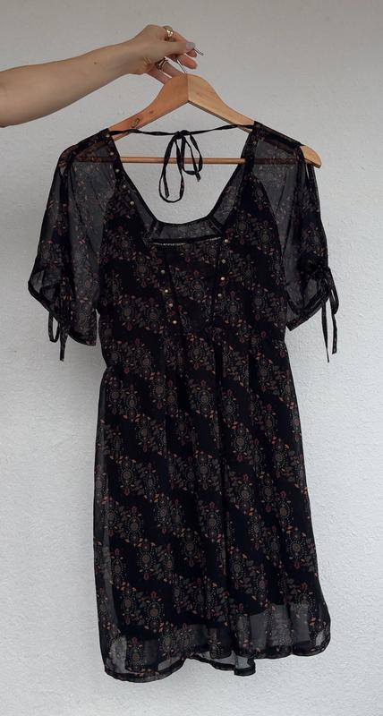 Женское платье Seven Sisters мини с подкладкой, с завязками на рукавах и сзади в романтичном стиле принтованное Недостатки - не все заклепки на месте (на фото).