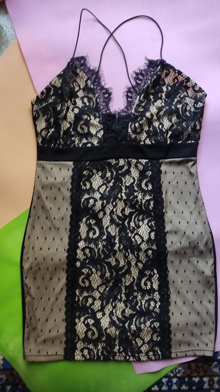 Платье короткое с кружевом на тонких лямочках, на спине молния, очень красиво садится по фигуре.