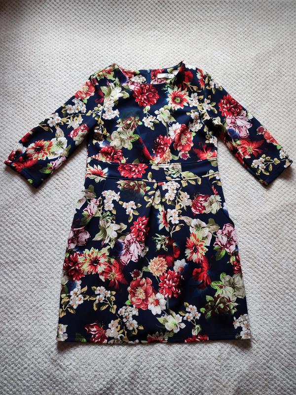 женское платье, есть карманидаи вытачки вверх и вниз от пояса, ткань тянется, цвет темно-синий с цветочным принтом длина изделия 94 см. навел обхват талии 47 см полуюхват груди 50 см рукав 3/4 длина 45 см