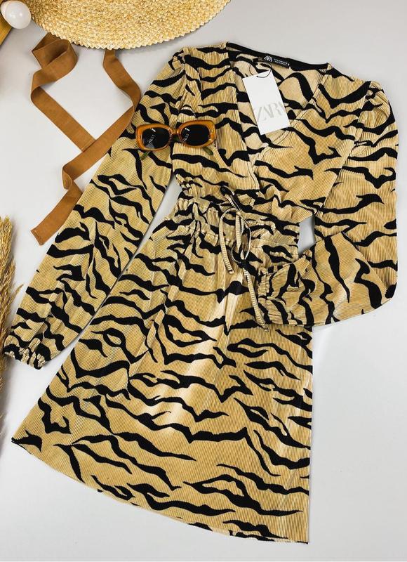 Сукня Zara з анімалістичним принтом з тканини жатки та блискучим ефектом! Нарядно виглядає і не просвічується, хоча йде без підкладки! Пояс на резинці, гарно підкреслює фігуру! Нова, ні разу не вдягалася, але без бірки, відірвала одразу як купила (на фото видно, що бірка була)! Мені завелика, бо ношу розмір XS та S. Ідеально з лосінами і колготками під високі чоботи. Коштувала 1299 грн, віддаю зі знижкою 50%.