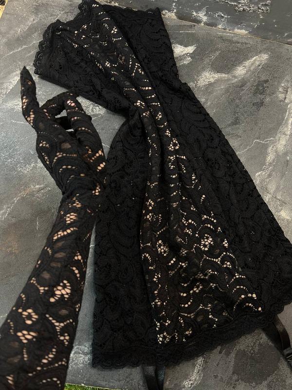 Это корсетное платье - настоящее произведение искусства, подчеркивающее элегантность и утонченность. Мягкий эластичный гипюр окутывает тело, раскрывая кружевные узоры, которые нежно контрастируют с кожей. Глубокий черный цвет добавляет загадочности, а крепления для чулок делают образ еще более интригующим и игривым. Ажурные высокие перчатки продолжают мотив кружева Цена платья 2950 грн, перчатки 900 грн
