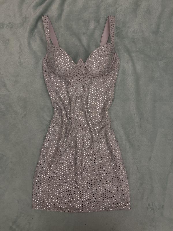 Мини платье, размер ХС-С. Очень красиво садится по фигуре, имеет блестящие стразы, они не отпадают, состояние идеально