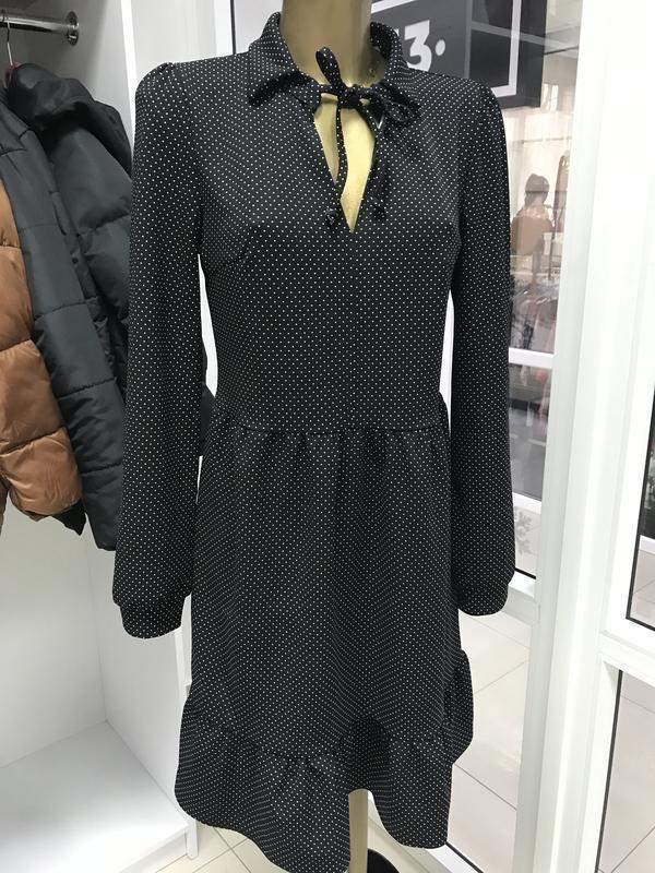 Улюблений горошок. Ну, дууже красивое платье, красиво подчеркивает талию, красивый крой. Красиво смотрится рукав Подойдет как под каблук так и под кроссы Материал: креп-дайвинг 65% viscosa плюс полиэстер Размер:s Длина 91 см плюс воротничок Ширина между лопатками 32 см Рукав 63 см Ширина между подмышками 42,5 см Талия до 38 см и еще чуточку может потянуться