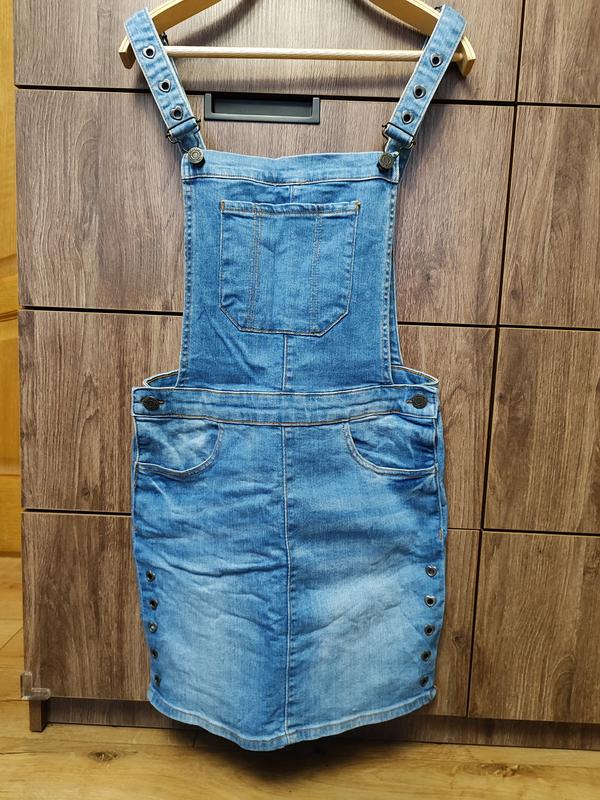 джинсовый сарафан с юбкой длиной мини и металлическими элементами сердечками