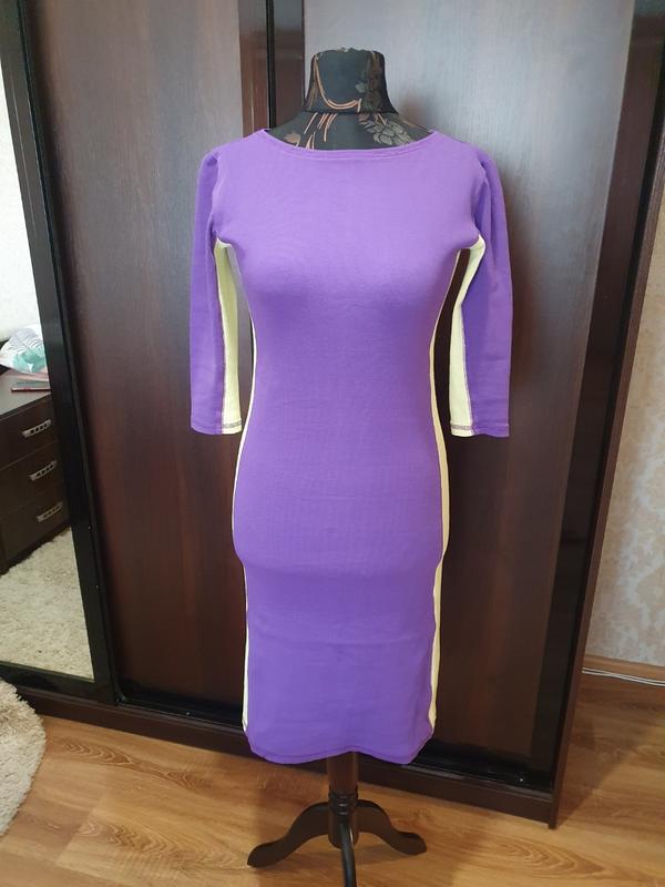 Хлопкова сукня в рубчик. Колор блок сиреневый с лимонным. Не просвечивает, очень эффектно садится по фигуре. Замеры в спокойном состоянии: длина 97, рукав 3/4 -38см, плечи 35, приспущенные,ног 42, нот 38, нос 42.