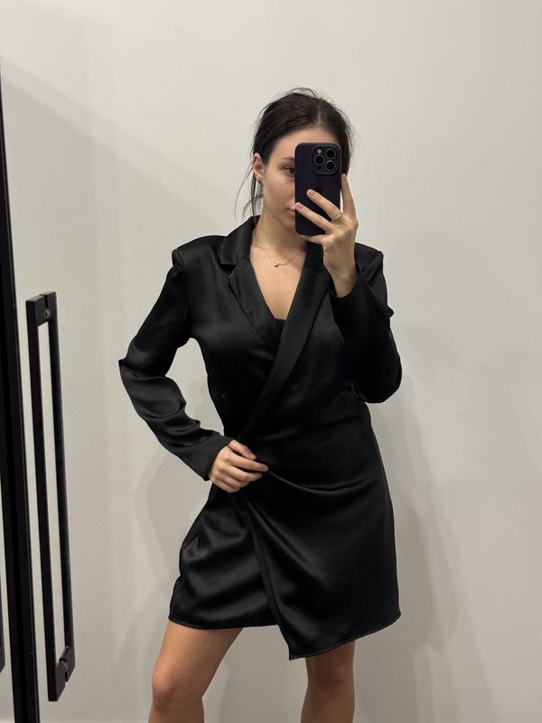 Идеальное атласное платье Zara на запах с подплечниками и шикарным декольте Размер S-M Стан - идеальный Замеры: Длина по спинке -79 Длина рукава -60 Полу плечи -41 Пол талия - 37 ( но пуговица можно редактировать)