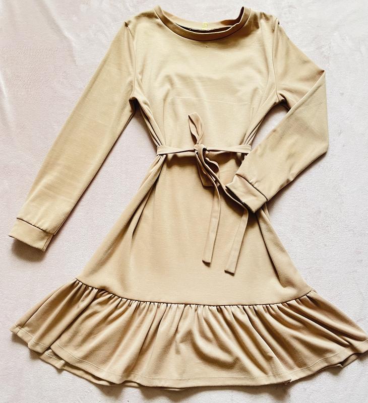 Бежевое платье с воланом по низу, с поясом, можно носить без, р.S 👗 Есть небольшая затяжка в районе горловины (указано на фото), в остальном состояние очень хорошее. Длина - 89 Плечи - 38 Рукав - 57 ПОГ - 44 ПОТ - 43 ПОБ - 45 Базовая вещь гардероба, сочетается с чем угодно!