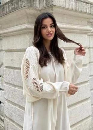 Плаття бохо, розлітайка від бренда H&M - Із широкими рукавами, тип кажана з вставкою мереживного плетіння; - Колір беж Заміри: довжина спереду від горловини 77 см довжина ззаду від спинки 59 см довжина рукава 69 см НОГ 61 см ПОТ 78 см НОС 90 см